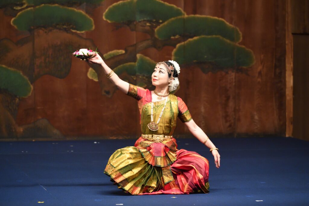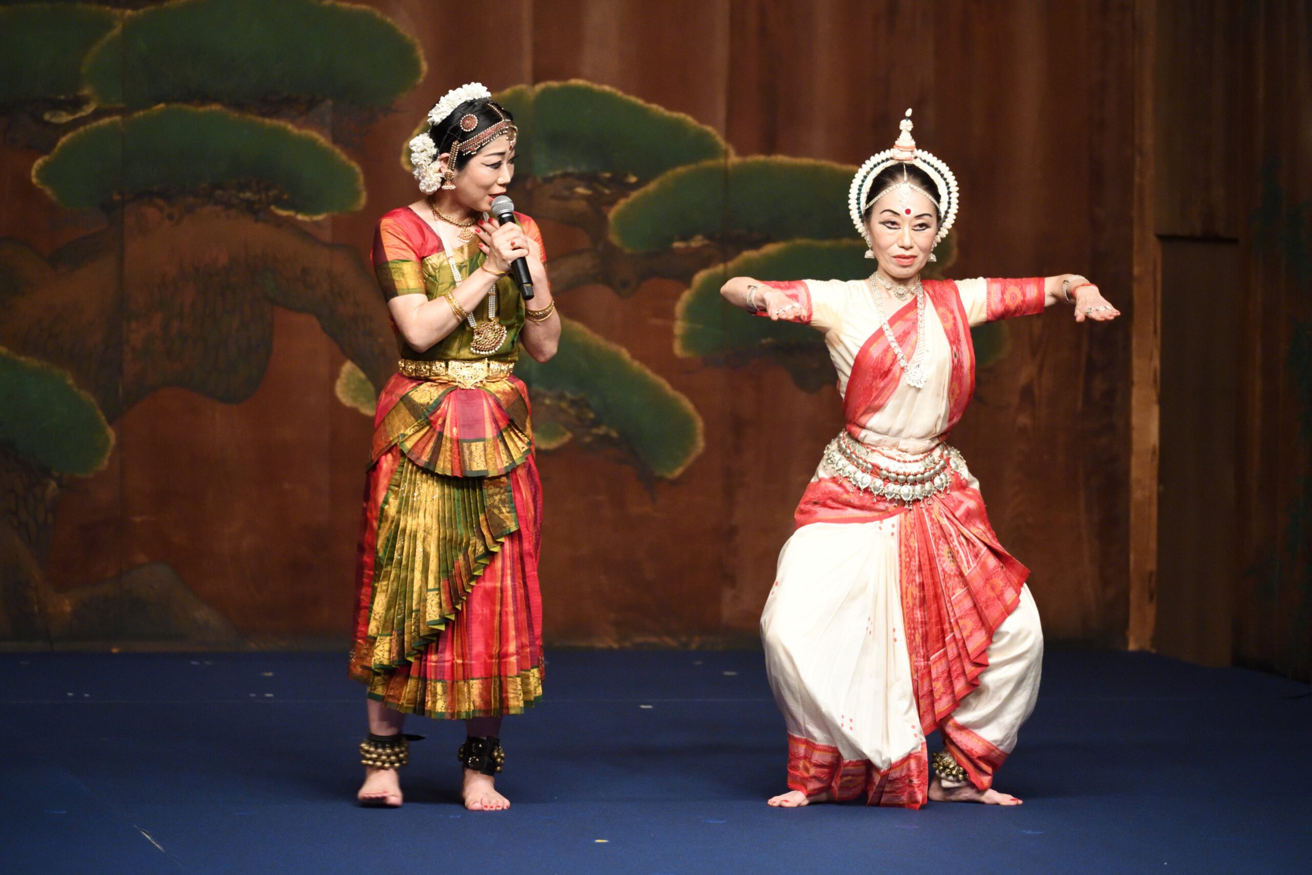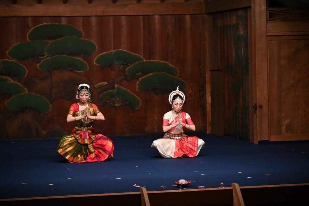 インド舞踊は4000年もの歴史を誇る世界最古の民族舞踊です。しかも単なる踊りではなく、踊りが神との意思交流を図る唯一の手段だったため、一挙手一動作に意味があり、わずかな目の動きにも魂が込められています。地域や歴史的背景によって多様なスタイルが存在します。今回、能舞台の上で披露いただいたのは、野中ミキさんと金澤倫子さんのお二人でした。