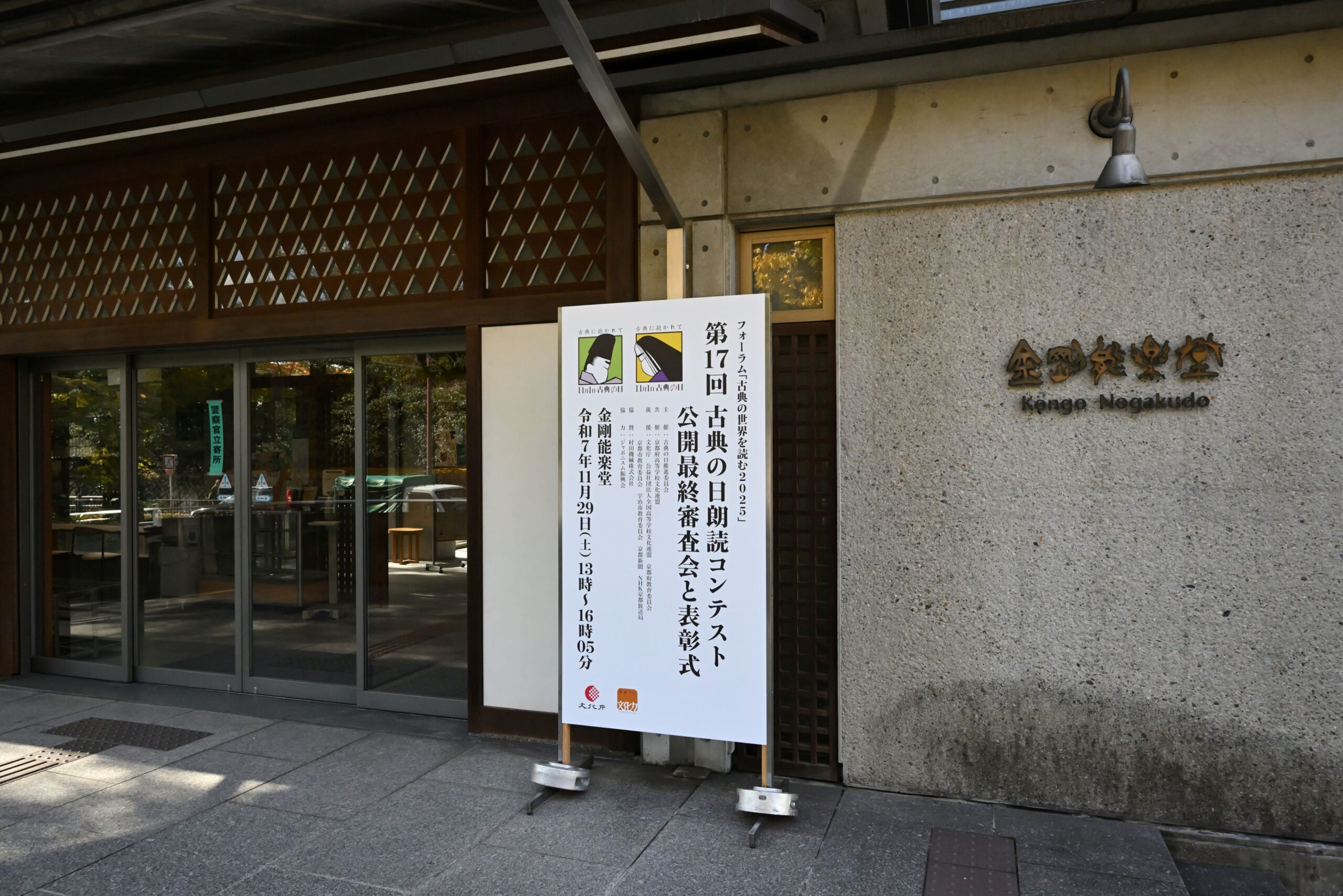 会場の金剛能楽堂前の烏丸通りのイチョウも綺麗に黄色に色づき、紅葉が美しく映える青空の11月29日(土)に、第17回古典の日朗読コンテスト公開最終審査会と表彰式が開催されました。